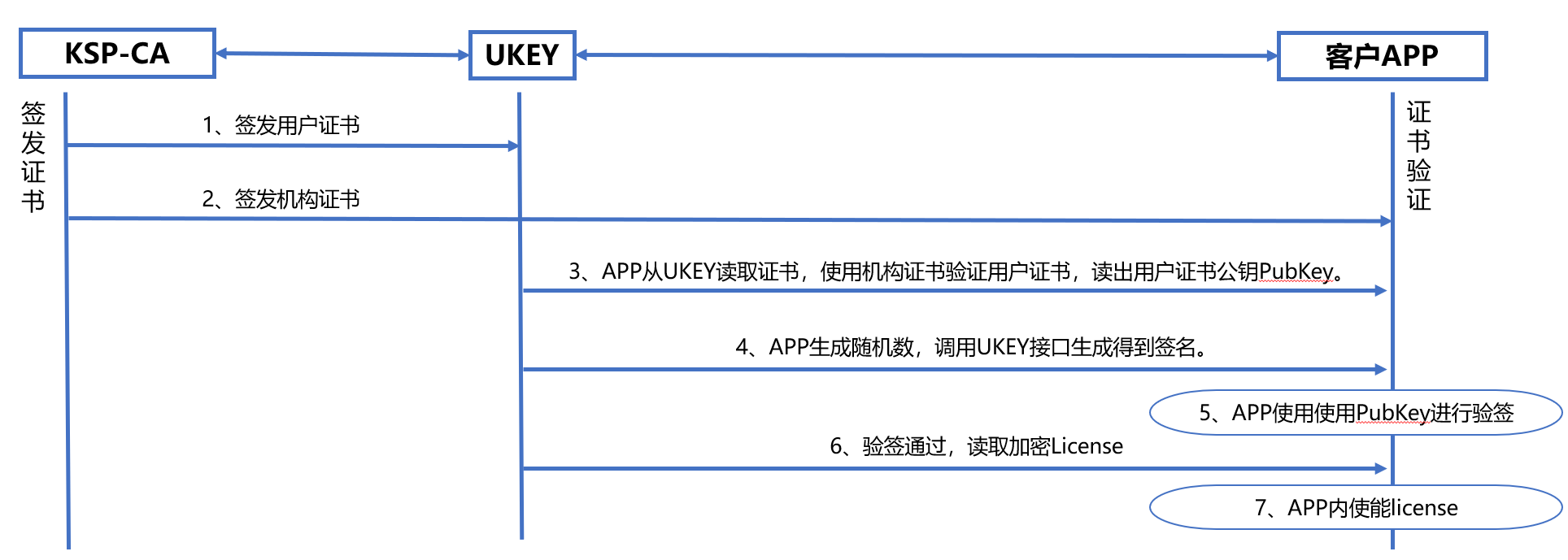 3、客户APP 客户自己的应用。授权过程中客户APP要完成的主要工作: a、首先使用机构证书验证UKEY中的客户证书有效性。 b、通过签名验签认证,验证此证书跟UKEY硬件是匹配的。 c、认证通过读取UKEY内的加密license码,解密后在APP内使用license。